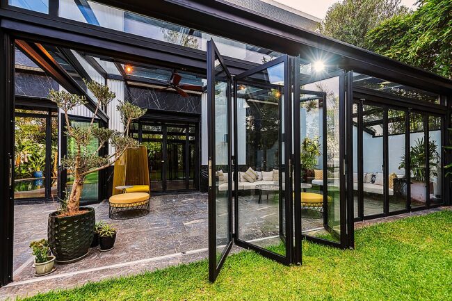 Jansen propose une gamme de portes accordéon vitrées de 1 à 10 vantaux que ce soit en série traditionnelle ou à rupture de pont thermique.